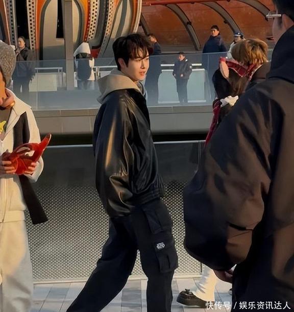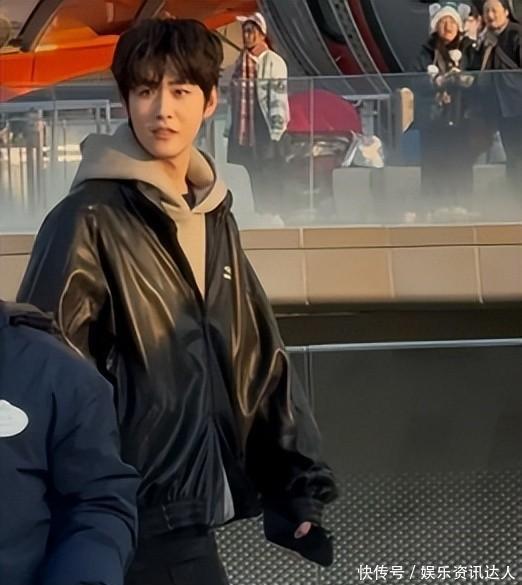 田嘉瑞穿了件黑皮衣,里头套了件棕色卫衣,底下是黑失业裤配白畅通鞋,看着纯粹还和缓。