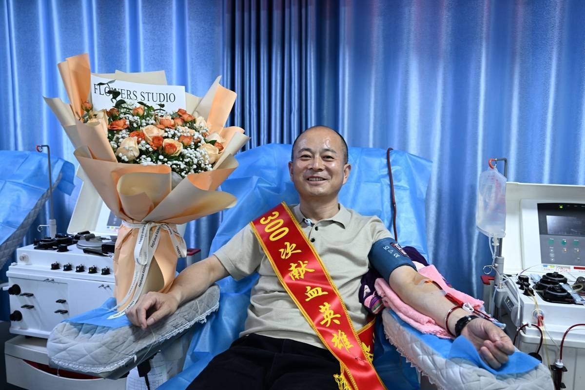 填表、体检、初筛……各项检测及格后,45岁的秦义半躺在采血椅上,鲜红的血液从左臂渐渐流出。19年来,他坚捏无偿献血,今日是他第300次挽袖献爱心。